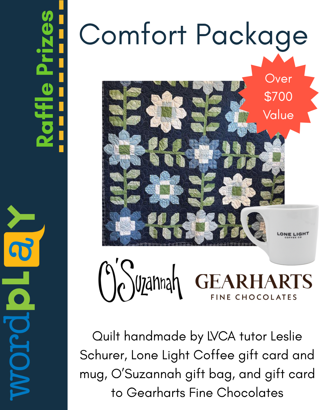 Quilt handmade by LVCA tutor Leslie Schurer, Lone Light Coffee gift card and mug, O’Suzannah gift bag, and gift card to Gearharts Fine Chocolates. Valued at over $700.