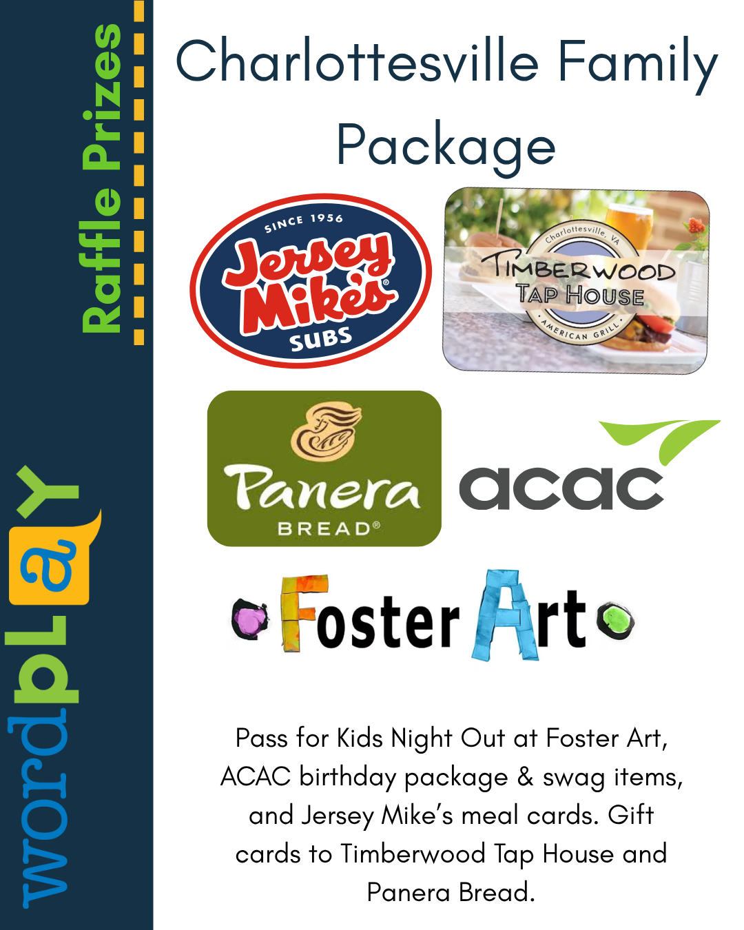 Pass for Kids Night Out at Foster Art, ACAC birthday package & swag items, and Jersey Mike’s meal cards. Gift cards to Timberwood Tap House and Panera Bread.