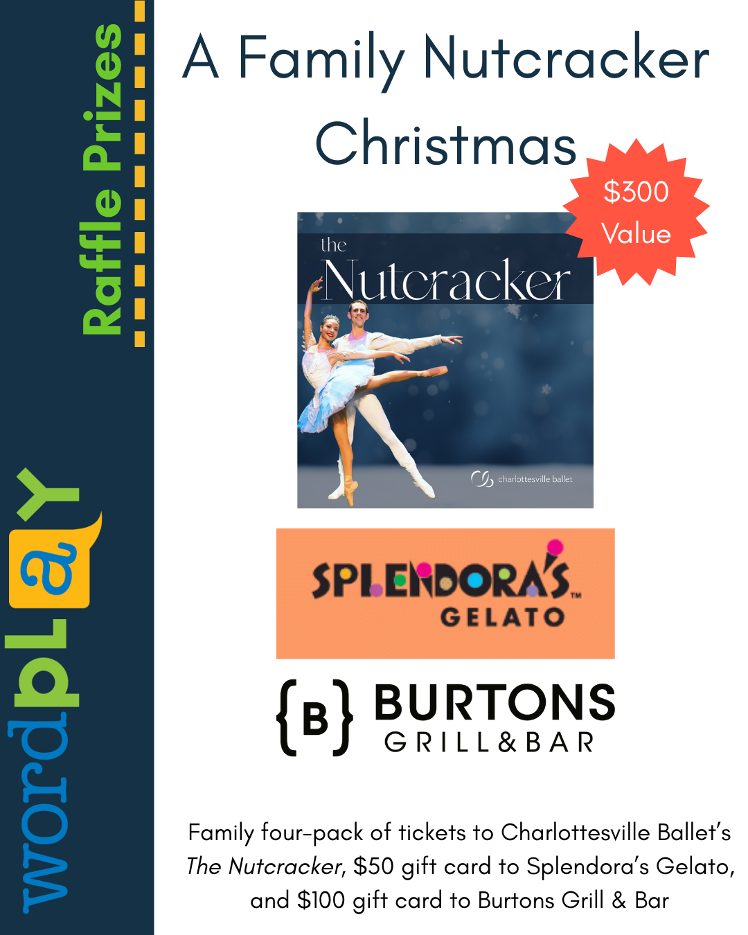 This package includes a family four-pack of tickets to Charlottesville Ballet’s The Nutcracker for the 2026-2027 season. This package also includes a $50 gift card to Splendora’s Gelato, and a $100 gift card to Burtons Grill & Bar.